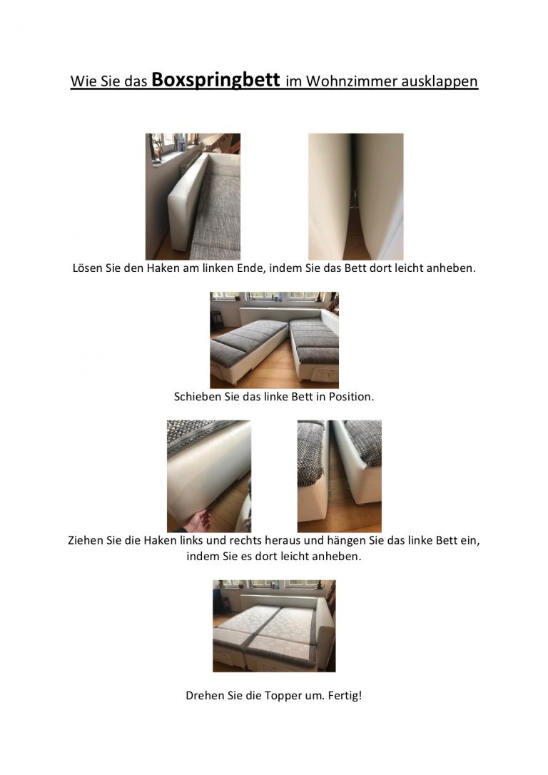 Für unsere Sofas finden Sie hier eine Anleitung zum Ausklappen. In der Regel sind aber alle Betten schon vorher ausgezogen und hergerichtet. Die Anleitung brauchen Sie also nur, falls Sie die Zimmeraufteilung doch etwas anders gestalten möchten.